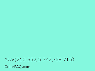 YUV 210.352,5.742,-68.715 Color is a light cyan color and the nearest color is Aquamarine #7fffd4. Hex code #84f8de and RGB value is rgb(132,248,222). In RGB color space, this color is composed of 52% red, 97% green, 87% blue, In CMYK color space, this color is composed of 47% cyan, 0% magenta, 10% yellow , 3% black , In HSL color space, this color has a hue angle of 167° , 89% saturation and 75% lightness.