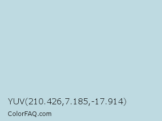 YUV 210.426,7.185,-17.914 Color is a very light cyan color and the nearest color is Ziggurat #bfdbe2. Hex code #bedae1 and RGB value is rgb(190,218,225). In RGB color space, this color is composed of 75% red, 85% green, 88% blue, In CMYK color space, this color is composed of 16% cyan, 3% magenta, 0% yellow , 12% black , In HSL color space, this color has a hue angle of 192° , 37% saturation and 81% lightness.