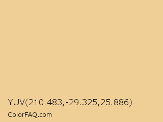 YUV 210.483,-29.325,25.886 Color is a light orange color and the nearest color is Manhattan #f5c999. Hex code #f0cf97 and RGB value is rgb(240,207,151). In RGB color space, this color is composed of 94% red, 81% green, 59% blue, In CMYK color space, this color is composed of 0% cyan, 14% magenta, 37% yellow , 6% black , In HSL color space, this color has a hue angle of 38° , 75% saturation and 77% lightness.