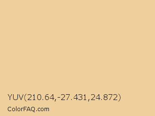 YUV 210.64,-27.431,24.872 Color is a light orange color and the nearest color is New Orleans #f3d69d. Hex code #efcf9b and RGB value is rgb(239,207,155). In RGB color space, this color is composed of 94% red, 81% green, 61% blue, In CMYK color space, this color is composed of 0% cyan, 13% magenta, 35% yellow , 6% black , In HSL color space, this color has a hue angle of 37° , 72% saturation and 77% lightness.