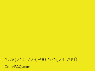 YUV 210.723,-90.575,24.799 Color is a normal yellow color and the nearest color is Piss Yellow #e1e115. Hex code #efe81b and RGB value is rgb(239,232,27). In RGB color space, this color is composed of 94% red, 91% green, 11% blue, In CMYK color space, this color is composed of 0% cyan, 3% magenta, 89% yellow , 6% black , In HSL color space, this color has a hue angle of 58° , 87% saturation and 52% lightness.