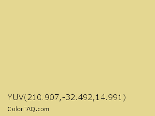 YUV 210.907,-32.492,14.991 Color is a light yellow color and the nearest color is Zombie #e4d69b. Hex code #e4d791 and RGB value is rgb(228,215,145). In RGB color space, this color is composed of 89% red, 84% green, 57% blue, In CMYK color space, this color is composed of 0% cyan, 6% magenta, 36% yellow , 11% black , In HSL color space, this color has a hue angle of 51° , 61% saturation and 73% lightness.