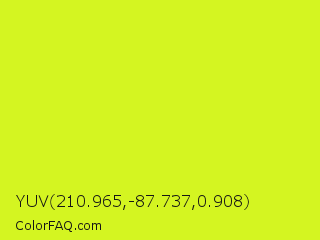 YUV 210.965,-87.737,0.908 Color is a normal yellow color and the nearest color is Arctic Lime #d0ff14. Hex code #d4f521 and RGB value is rgb(212,245,33). In RGB color space, this color is composed of 83% red, 96% green, 13% blue, In CMYK color space, this color is composed of 13% cyan, 0% magenta, 87% yellow , 4% black , In HSL color space, this color has a hue angle of 69° , 91% saturation and 55% lightness.
