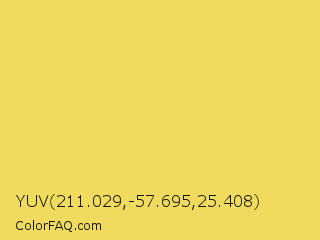 YUV 211.029,-57.695,25.408 Color is a light yellow color and the nearest color is Energy Yellow #f8dd5c. Hex code #f0db5e and RGB value is rgb(240,219,94). In RGB color space, this color is composed of 94% red, 86% green, 37% blue, In CMYK color space, this color is composed of 0% cyan, 9% magenta, 61% yellow , 6% black , In HSL color space, this color has a hue angle of 51° , 83% saturation and 65% lightness.