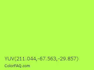 YUV 211.044,-67.563,-29.857 Color is a light green color and the nearest color is French Lime #9efd38. Hex code #b1ff4a and RGB value is rgb(177,255,74). In RGB color space, this color is composed of 69% red, 100% green, 29% blue, In CMYK color space, this color is composed of 31% cyan, 0% magenta, 71% yellow , 0% black , In HSL color space, this color has a hue angle of 86° , 100% saturation and 65% lightness.