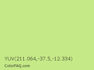 YUV 211.064,-37.5,-12.334 Color is a light green color and the nearest color is Medium Spring Bud #c9dc87. Hex code #c5e987 and RGB value is rgb(197,233,135). In RGB color space, this color is composed of 77% red, 91% green, 53% blue, In CMYK color space, this color is composed of 15% cyan, 0% magenta, 42% yellow , 9% black , In HSL color space, this color has a hue angle of 82° , 69% saturation and 72% lightness.