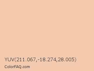 YUV 211.067,-18.274,28.005 Color is a very light orange color and the nearest color is Desert Sand #edc9af. Hex code #f3caae and RGB value is rgb(243,202,174). In RGB color space, this color is composed of 95% red, 79% green, 68% blue, In CMYK color space, this color is composed of 0% cyan, 17% magenta, 28% yellow , 5% black , In HSL color space, this color has a hue angle of 24° , 74% saturation and 82% lightness.