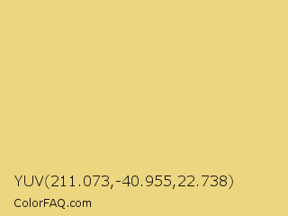 YUV 211.073,-40.955,22.738 Color is a light yellow color and the nearest color is Flax #eedc82. Hex code #edd680 and RGB value is rgb(237,214,128). In RGB color space, this color is composed of 93% red, 84% green, 50% blue, In CMYK color space, this color is composed of 0% cyan, 10% magenta, 46% yellow , 7% black , In HSL color space, this color has a hue angle of 47° , 75% saturation and 72% lightness.