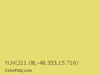 YUV 211.08,-48.353,15.716 Color is a light yellow color and the nearest color is Straw #e4d96f. Hex code #e5dd71 and RGB value is rgb(229,221,113). In RGB color space, this color is composed of 90% red, 87% green, 44% blue, In CMYK color space, this color is composed of 0% cyan, 3% magenta, 51% yellow , 10% black , In HSL color space, this color has a hue angle of 56° , 69% saturation and 67% lightness.