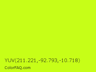 YUV 211.221,-92.793,-10.718 Color is a normal lime color and the nearest color is Arctic Lime #d0ff14. Hex code #c7fe17 and RGB value is rgb(199,254,23). In RGB color space, this color is composed of 78% red, 100% green, 9% blue, In CMYK color space, this color is composed of 22% cyan, 0% magenta, 91% yellow , 0% black , In HSL color space, this color has a hue angle of 74° , 99% saturation and 54% lightness.