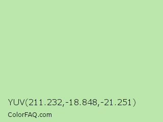 YUV 211.232,-18.848,-21.251 Color is a light green color and the nearest color is Moss Green #addfad. Hex code #bbe7ad and RGB value is rgb(187,231,173). In RGB color space, this color is composed of 73% red, 91% green, 68% blue, In CMYK color space, this color is composed of 19% cyan, 0% magenta, 25% yellow , 9% black , In HSL color space, this color has a hue angle of 106° , 55% saturation and 79% lightness.