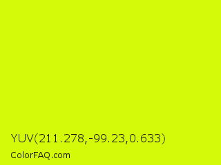YUV 211.278,-99.23,0.633 Color is a normal yellow color and the nearest color is Arctic Lime #d0ff14. Hex code #d4fa0a and RGB value is rgb(212,250,10). In RGB color space, this color is composed of 83% red, 98% green, 4% blue, In CMYK color space, this color is composed of 15% cyan, 0% magenta, 96% yellow , 2% black , In HSL color space, this color has a hue angle of 70° , 96% saturation and 51% lightness.