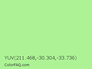 YUV 211.468,-30.304,-33.736 Color is a light green color and the nearest color is Granny Smith Apple #a8e4a0. Hex code #adf396 and RGB value is rgb(173,243,150). In RGB color space, this color is composed of 68% red, 95% green, 59% blue, In CMYK color space, this color is composed of 29% cyan, 0% magenta, 38% yellow , 5% black , In HSL color space, this color has a hue angle of 105° , 79% saturation and 77% lightness.