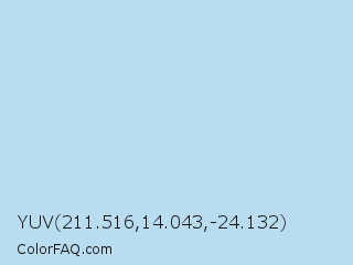YUV 211.516,14.043,-24.132 Color is a very light blue color and the nearest color is Sail #b8e0f9. Hex code #b8dcf0 and RGB value is rgb(184,220,240). In RGB color space, this color is composed of 72% red, 86% green, 94% blue, In CMYK color space, this color is composed of 23% cyan, 8% magenta, 0% yellow , 6% black , In HSL color space, this color has a hue angle of 201° , 65% saturation and 83% lightness.