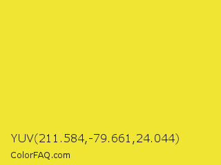 YUV 211.584,-79.661,24.044 Color is a normal yellow color and the nearest color is Dandelion #f0e130. Hex code #efe532 and RGB value is rgb(239,229,50). In RGB color space, this color is composed of 94% red, 90% green, 20% blue, In CMYK color space, this color is composed of 0% cyan, 4% magenta, 79% yellow , 6% black , In HSL color space, this color has a hue angle of 57° , 86% saturation and 57% lightness.