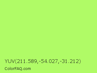 YUV 211.589,-54.027,-31.212 Color is a light green color and the nearest color is Inchworm #b2ec5d. Hex code #b0fb66 and RGB value is rgb(176,251,102). In RGB color space, this color is composed of 69% red, 98% green, 40% blue, In CMYK color space, this color is composed of 30% cyan, 0% magenta, 59% yellow , 2% black , In HSL color space, this color has a hue angle of 90° , 95% saturation and 69% lightness.