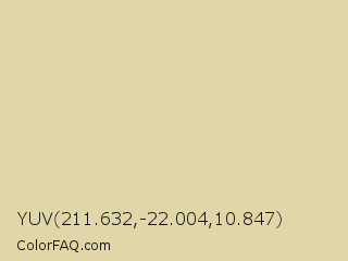 YUV 211.632,-22.004,10.847 Color is a light yellow color and the nearest color is Sapling #ded4a4. Hex code #e0d6a7 and RGB value is rgb(224,214,167). In RGB color space, this color is composed of 88% red, 84% green, 65% blue, In CMYK color space, this color is composed of 0% cyan, 4% magenta, 25% yellow , 12% black , In HSL color space, this color has a hue angle of 49° , 48% saturation and 77% lightness.