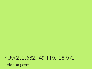 YUV 211.632,-49.119,-18.971 Color is a light green color and the nearest color is Sulu #c1f07c. Hex code #bef270 and RGB value is rgb(190,242,112). In RGB color space, this color is composed of 75% red, 95% green, 44% blue, In CMYK color space, this color is composed of 21% cyan, 0% magenta, 54% yellow , 5% black , In HSL color space, this color has a hue angle of 84° , 83% saturation and 69% lightness.
