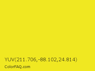 YUV 211.706,-88.102,24.814 Color is a normal yellow color and the nearest color is Dandelion #f0e130. Hex code #f0e821 and RGB value is rgb(240,232,33). In RGB color space, this color is composed of 94% red, 91% green, 13% blue, In CMYK color space, this color is composed of 0% cyan, 3% magenta, 86% yellow , 6% black , In HSL color space, this color has a hue angle of 58° , 87% saturation and 54% lightness.