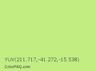 YUV 211.717,-41.272,-15.538 Color is a light green color and the nearest color is Sulu #c1f07c. Hex code #c2ed80 and RGB value is rgb(194,237,128). In RGB color space, this color is composed of 76% red, 93% green, 50% blue, In CMYK color space, this color is composed of 18% cyan, 0% magenta, 46% yellow , 7% black , In HSL color space, this color has a hue angle of 84° , 75% saturation and 72% lightness.