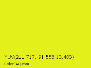 YUV 211.717,-91.558,13.403 Color is a normal yellow color and the nearest color is Piss Yellow #e1e115. Hex code #e3f01a and RGB value is rgb(227,240,26). In RGB color space, this color is composed of 89% red, 94% green, 10% blue, In CMYK color space, this color is composed of 5% cyan, 0% magenta, 89% yellow , 6% black , In HSL color space, this color has a hue angle of 64° , 88% saturation and 52% lightness.