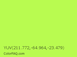 YUV 211.772,-64.964,-23.479 Color is a light green color and the nearest color is Inchworm #b2ec5d. Hex code #b9fb50 and RGB value is rgb(185,251,80). In RGB color space, this color is composed of 73% red, 98% green, 31% blue, In CMYK color space, this color is composed of 26% cyan, 0% magenta, 68% yellow , 2% black , In HSL color space, this color has a hue angle of 83° , 96% saturation and 65% lightness.