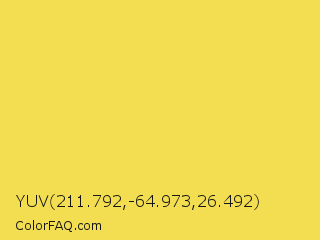 YUV 211.792,-64.973,26.492 Color is a light yellow color and the nearest color is Minion Yellow #f5e050. Hex code #f2de50 and RGB value is rgb(242,222,80). In RGB color space, this color is composed of 95% red, 87% green, 31% blue, In CMYK color space, this color is composed of 0% cyan, 8% magenta, 67% yellow , 5% black , In HSL color space, this color has a hue angle of 53° , 86% saturation and 63% lightness.