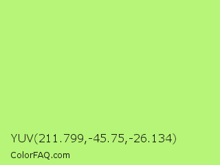 YUV 211.799,-45.75,-26.134 Color is a light green color and the nearest color is Sulu #c1f07c. Hex code #b6f577 and RGB value is rgb(182,245,119). In RGB color space, this color is composed of 71% red, 96% green, 47% blue, In CMYK color space, this color is composed of 26% cyan, 0% magenta, 51% yellow , 4% black , In HSL color space, this color has a hue angle of 90° , 86% saturation and 71% lightness.