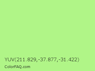 YUV 211.829,-37.877,-31.422 Color is a light green color and the nearest color is Sulu #c1f07c. Hex code #b0f587 and RGB value is rgb(176,245,135). In RGB color space, this color is composed of 69% red, 96% green, 53% blue, In CMYK color space, this color is composed of 28% cyan, 0% magenta, 45% yellow , 4% black , In HSL color space, this color has a hue angle of 98° , 85% saturation and 75% lightness.