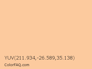 YUV 211.934,-26.589,35.138 Color is a light orange color and the nearest color is Peach Orange #ffcc99. Hex code #fcca9e and RGB value is rgb(252,202,158). In RGB color space, this color is composed of 99% red, 79% green, 62% blue, In CMYK color space, this color is composed of 0% cyan, 20% magenta, 37% yellow , 1% black , In HSL color space, this color has a hue angle of 28° , 94% saturation and 80% lightness.