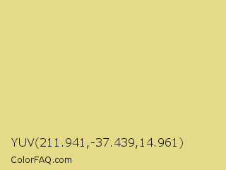 YUV 211.941,-37.439,14.961 Color is a light yellow color and the nearest color is Flax #eedc82. Hex code #e5da88 and RGB value is rgb(229,218,136). In RGB color space, this color is composed of 90% red, 85% green, 53% blue, In CMYK color space, this color is composed of 0% cyan, 5% magenta, 41% yellow , 10% black , In HSL color space, this color has a hue angle of 53° , 64% saturation and 72% lightness.