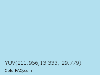 YUV 211.956,13.333,-29.779 Color is a very light blue color and the nearest color is Blizzard Blue #ace5ee. Hex code #b2e0ef and RGB value is rgb(178,224,239). In RGB color space, this color is composed of 70% red, 88% green, 94% blue, In CMYK color space, this color is composed of 26% cyan, 6% magenta, 0% yellow , 6% black , In HSL color space, this color has a hue angle of 195° , 66% saturation and 82% lightness.