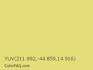 YUV 211.992,-44.859,14.916 Color is a light yellow color and the nearest color is Straw #e4d96f. Hex code #e5dd79 and RGB value is rgb(229,221,121). In RGB color space, this color is composed of 90% red, 87% green, 47% blue, In CMYK color space, this color is composed of 0% cyan, 3% magenta, 47% yellow , 10% black , In HSL color space, this color has a hue angle of 56° , 68% saturation and 69% lightness.