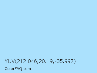 YUV 212.046,20.19,-35.997 Color is a very light blue color and the nearest color is Fresh Air #a6e7ff. Hex code #abe1fd and RGB value is rgb(171,225,253). In RGB color space, this color is composed of 67% red, 88% green, 99% blue, In CMYK color space, this color is composed of 32% cyan, 11% magenta, 0% yellow , 1% black , In HSL color space, this color has a hue angle of 200° , 95% saturation and 83% lightness.
