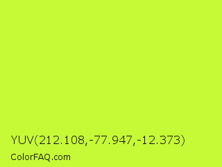YUV 212.108,-77.947,-12.373 Color is a normal lime color and the nearest color is Green Yellow #adff2f. Hex code #c6fa36 and RGB value is rgb(198,250,54). In RGB color space, this color is composed of 78% red, 98% green, 21% blue, In CMYK color space, this color is composed of 21% cyan, 0% magenta, 78% yellow , 2% black , In HSL color space, this color has a hue angle of 76° , 95% saturation and 60% lightness.