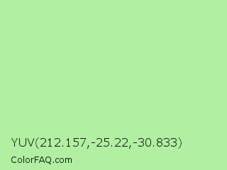 YUV 212.157,-25.22,-30.833 Color is a light green color and the nearest color is Granny Smith Apple #a8e4a0. Hex code #b1f0a1 and RGB value is rgb(177,240,161). In RGB color space, this color is composed of 69% red, 94% green, 63% blue, In CMYK color space, this color is composed of 26% cyan, 0% magenta, 33% yellow , 6% black , In HSL color space, this color has a hue angle of 108° , 72% saturation and 79% lightness.