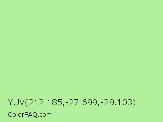 YUV 212.185,-27.699,-29.103 Color is a light green color and the nearest color is Granny Smith Apple #a8e4a0. Hex code #b3f09c and RGB value is rgb(179,240,156). In RGB color space, this color is composed of 70% red, 94% green, 61% blue, In CMYK color space, this color is composed of 25% cyan, 0% magenta, 35% yellow , 6% black , In HSL color space, this color has a hue angle of 104° , 74% saturation and 78% lightness.