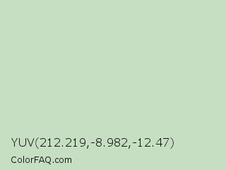 YUV 212.219,-8.982,-12.47 Color is a very light green color and the nearest color is Sea Mist #c5dbca. Hex code #c6dfc2 and RGB value is rgb(198,223,194). In RGB color space, this color is composed of 78% red, 87% green, 76% blue, In CMYK color space, this color is composed of 11% cyan, 0% magenta, 13% yellow , 13% black , In HSL color space, this color has a hue angle of 112° , 31% saturation and 82% lightness.