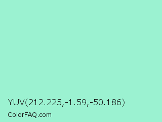 YUV 212.225,-1.59,-50.186 Color is a light green color and the nearest color is Magic Mint #aaf0d1. Hex code #9bf2d1 and RGB value is rgb(155,242,209). In RGB color space, this color is composed of 61% red, 95% green, 82% blue, In CMYK color space, this color is composed of 36% cyan, 0% magenta, 14% yellow , 5% black , In HSL color space, this color has a hue angle of 157° , 77% saturation and 78% lightness.