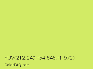 YUV 212.249,-54.846,-1.972 Color is a light lime color and the nearest color is Booger Buster #dde26a. Hex code #d2eb65 and RGB value is rgb(210,235,101). In RGB color space, this color is composed of 82% red, 92% green, 40% blue, In CMYK color space, this color is composed of 11% cyan, 0% magenta, 57% yellow , 8% black , In HSL color space, this color has a hue angle of 71° , 77% saturation and 66% lightness.