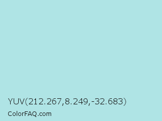 YUV 212.267,8.249,-32.683 Color is a light cyan color and the nearest color is Powder Blue #b0e0e6. Hex code #afe4e5 and RGB value is rgb(175,228,229). In RGB color space, this color is composed of 69% red, 89% green, 90% blue, In CMYK color space, this color is composed of 24% cyan, 0% magenta, 0% yellow , 10% black , In HSL color space, this color has a hue angle of 181° , 51% saturation and 79% lightness.