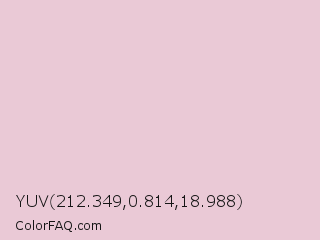 YUV 212.349,0.814,18.988 Color is a very light rose color and the nearest color is Queen Pink #e8ccd7. Hex code #eac9d6 and RGB value is rgb(234,201,214). In RGB color space, this color is composed of 92% red, 79% green, 84% blue, In CMYK color space, this color is composed of 0% cyan, 14% magenta, 9% yellow , 8% black , In HSL color space, this color has a hue angle of 336° , 44% saturation and 85% lightness.