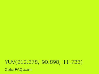 YUV 212.378,-90.898,-11.733 Color is a normal lime color and the nearest color is Arctic Lime #d0ff14. Hex code #c7ff1c and RGB value is rgb(199,255,28). In RGB color space, this color is composed of 78% red, 100% green, 11% blue, In CMYK color space, this color is composed of 22% cyan, 0% magenta, 89% yellow , 0% black , In HSL color space, this color has a hue angle of 75° , 100% saturation and 55% lightness.