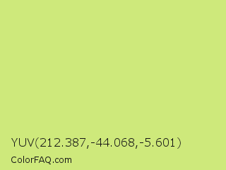 YUV 212.387,-44.068,-5.601 Color is a light lime color and the nearest color is Yellow Green #c5e17a. Hex code #cee97b and RGB value is rgb(206,233,123). In RGB color space, this color is composed of 81% red, 91% green, 48% blue, In CMYK color space, this color is composed of 12% cyan, 0% magenta, 47% yellow , 9% black , In HSL color space, this color has a hue angle of 75° , 71% saturation and 70% lightness.