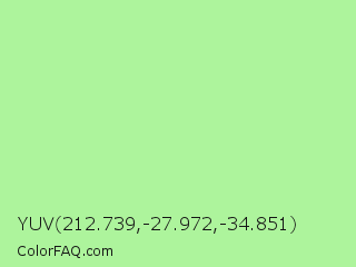 YUV 212.739,-27.972,-34.851 Color is a light green color and the nearest color is Granny Smith Apple #a8e4a0. Hex code #adf49c and RGB value is rgb(173,244,156). In RGB color space, this color is composed of 68% red, 96% green, 61% blue, In CMYK color space, this color is composed of 29% cyan, 0% magenta, 36% yellow , 4% black , In HSL color space, this color has a hue angle of 108° , 80% saturation and 78% lightness.