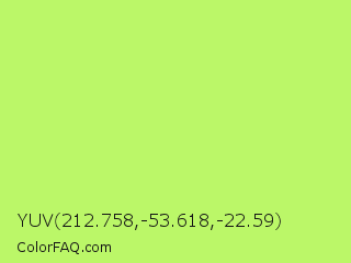 YUV 212.758,-53.618,-22.59 Color is a light green color and the nearest color is Inchworm #b2ec5d. Hex code #bbf768 and RGB value is rgb(187,247,104). In RGB color space, this color is composed of 73% red, 97% green, 41% blue, In CMYK color space, this color is composed of 24% cyan, 0% magenta, 58% yellow , 3% black , In HSL color space, this color has a hue angle of 85° , 90% saturation and 69% lightness.