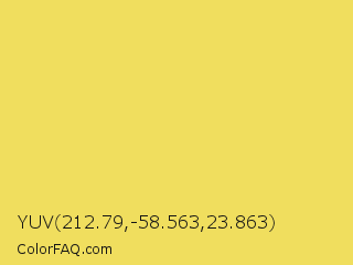 YUV 212.79,-58.563,23.863 Color is a light yellow color and the nearest color is Energy Yellow #f8dd5c. Hex code #f0de5e and RGB value is rgb(240,222,94). In RGB color space, this color is composed of 94% red, 87% green, 37% blue, In CMYK color space, this color is composed of 0% cyan, 8% magenta, 61% yellow , 6% black , In HSL color space, this color has a hue angle of 53° , 83% saturation and 65% lightness.