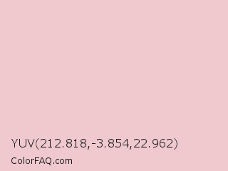 YUV 212.818,-3.854,22.962 Color is a very light red color and the nearest color is Oyster Pink #e9cecd. Hex code #efc9cd and RGB value is rgb(239,201,205). In RGB color space, this color is composed of 94% red, 79% green, 80% blue, In CMYK color space, this color is composed of 0% cyan, 16% magenta, 14% yellow , 6% black , In HSL color space, this color has a hue angle of 354° , 54% saturation and 86% lightness.