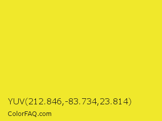 YUV 212.846,-83.734,23.814 Color is a normal yellow color and the nearest color is Dandelion #f0e130. Hex code #f0e82b and RGB value is rgb(240,232,43). In RGB color space, this color is composed of 94% red, 91% green, 17% blue, In CMYK color space, this color is composed of 0% cyan, 3% magenta, 82% yellow , 6% black , In HSL color space, this color has a hue angle of 58° , 87% saturation and 55% lightness.