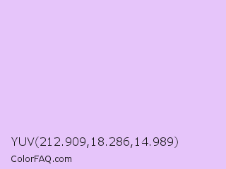 YUV 212.909,18.286,14.989 Color is a very light purple color and the nearest color is French Lilac #ecc7ee. Hex code #e6c5fa and RGB value is rgb(230,197,250). In RGB color space, this color is composed of 90% red, 77% green, 98% blue, In CMYK color space, this color is composed of 8% cyan, 21% magenta, 0% yellow , 2% black , In HSL color space, this color has a hue angle of 277° , 84% saturation and 88% lightness.